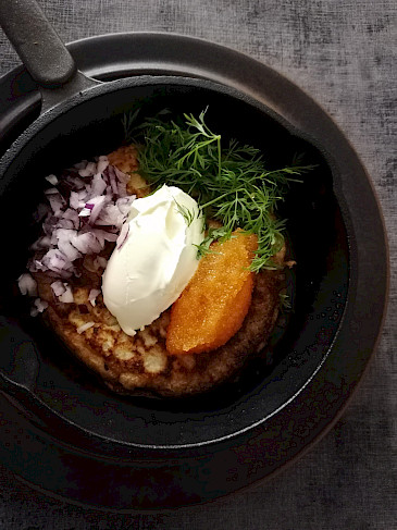 Tarjoa blinit smetanan, punasipulin ja mädin tai kylmäsavustetun lohen kanssa.