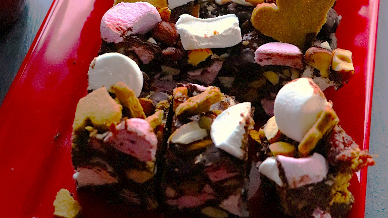 Rocky roadissa rouskuvat gluteenittomat piparkakut, pähkinät ja mantelit. herkun kruunaavat vaahtokarkit! Rocky road sopii hyvin lasten kanssa tehtäväksi. Kääri joululahjaksi ystävälle.