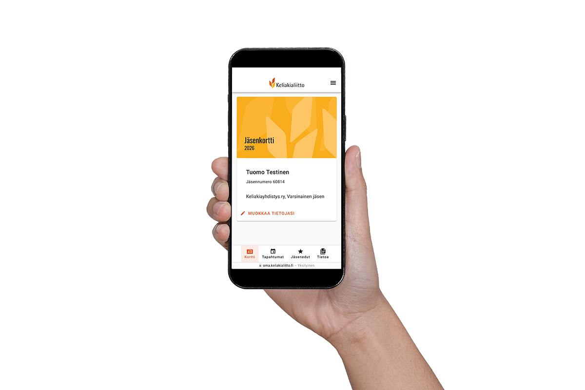 Voit käyttää jäsenkorttia myös ilman älypuhelinta, jos sinulla on käytössäsi tietokone tai tabletti. Kirjaudu silloin jäsenkorttiin verkkoselaimella osoitteessa: oma.keliakialiitto.fi.